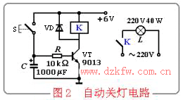圖T320是一個簡單實用的自動關燈電路。當按下按鈕開關S后,晶體管VT立即飽和導通,電源電壓(6 V)加在繼電器線圈的兩端,使它吸合,動合觸點閉合,“ 220 V、40 W ”的燈泡電源被接通而發光。同時,電容C被迅速充電,使它的兩端電壓也達6 V。當放開按鈕后,由電源提供電流IB的電路被切斷,但電容C兩端存在電壓,還能維持晶體管工作,隨著時間的延遲,電容中的電荷經過電阻R與晶體管的發射 結泄放,電容兩端的電壓逐漸下降,當晶體管UBE<0.5 V以后,VT截止,繼電器線圈失去電壓而釋放,觸點被打開,“ 220 V、40 W ”燈泡的電源被切斷而熄滅。這個電路,按一下按鈕開關S,燈亮20秒左右自動熄滅(延時時間的長短可調節電容C的容量),可做走廊照明燈的控制裝置。這個 實例告訴我們,利用繼電器可以低電壓(6 V)、弱電流(幾十毫安)來控制高電壓(220 V)、強電流(幾百毫安)的電路。如果需要控制更高的電壓和更大的電流,可以采用小繼電器控制大繼電器的方法來提高電路的驅動能力。