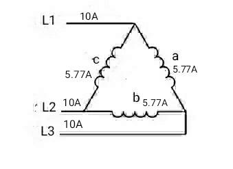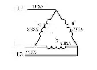 假設(shè)L2斷相,當(dāng)L1、L3線電流達(dá)到10×1.15=11.5A時(shí),熱繼電器應(yīng)在2h(小討)內(nèi)動作。這時(shí)a相電流為7.66A,b、c相電流為3.83A。這是因?yàn)樵跀嘞酄顟B(tài),b、c相串聯(lián)后再與a相并聯(lián),b、c相的總阻抗是a相阻抗的2倍,因此a相電流是b、c相的2倍。
