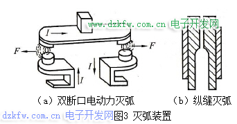 1)雙斷口電動力滅弧。該種滅弧裝置如圖3 (a)所示。這種滅弧方法是將整個電弧分割成兩段,同時利用觸頭回路本身的電動力F把電弧向兩側(cè)拉長,使電弧熱量在拉長的過程中散發(fā)、冷卻而熄滅。容量較小的交流接觸器,如CJ10 - 10型等,多采用這種方法滅弧。
