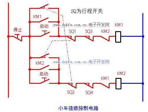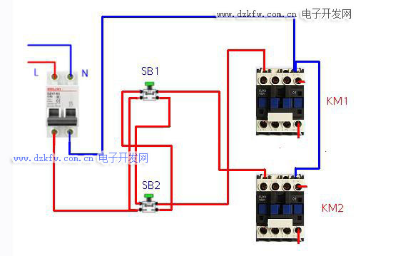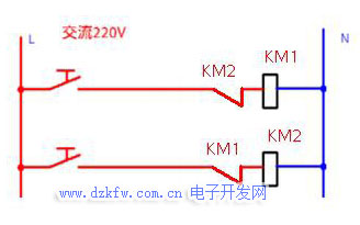 這個常用在接觸器的正反轉線路中,但是不夠完美,因為未知的一些因素偶爾還是會發生短路故障。