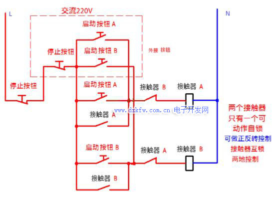我們再分析下這個圖:兩個接觸器是互鎖的,當按鈕A按下,接觸器A自鎖,同時接觸器A的輔助常閉觸點斷開,所以再按下按鈕B是沒有反應的,只能有一個自鎖,很適合用于電機正反轉線路。同時正反轉啟動各有兩組開關,可以實現異地控制。