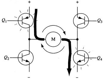 要使電機運轉,必須使對角線上的一對三極管導通。例如,如圖4.13所示,當Q1管和Q4管導通時,電流就從電源正極經Q1從左至右穿過電機,然后再經Q4回到電源負極。按圖中電流箭頭所示,該流向的電流將驅動電機順時針轉動。當三極管Q1和Q4導通時,電流將從左至右流過電機,從而驅動電機按特定方向轉動(電機周圍的箭頭指示為順時針方向)。