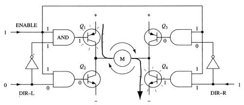 采用以上方法,電機的運轉就只需要用三個信號控制:兩個方向信號和一個使能信號。如果DIR-L信號為0,DIR-R信號為1,并且使能信號是1,那么三極管Q1和Q4導通,電流從左至右流經電機(如圖4.16所示);如果DIR-L信號變為1,而DIR-R信號變為0,那么Q2和Q3將導通,電流則反向流過電機。