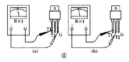 (3)把紅表筆接T1極,黑表筆接T2極,然后使T2與G短路,給G極加上正觸發(fā)信號(hào),電阻值仍為十歐左右,與G極脫開(kāi)后若阻值不變,則說(shuō)明管子經(jīng)觸發(fā)后,在T2一T1方向上也能維持導(dǎo)通狀態(tài),因此具有雙向觸發(fā)性質(zhì)。由此證明上述假定正確。否則是假定與實(shí)際不符,需再作出假定,重復(fù)以上測(cè)量。顯見(jiàn),在識(shí)別G、T1,的過(guò)程中,也就檢查了雙向可控硅的觸發(fā)能力。如果按哪種假定去測(cè)量,都不能使雙向可控硅觸發(fā)導(dǎo)通,證明管于巳損壞。對(duì)于lA的管子,亦可用RXl0檔檢測(cè),對(duì)于3A及3A以上的管子,應(yīng)選RXl檔,否則難以維持導(dǎo)通狀態(tài)。