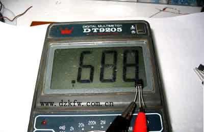 首先我們要先找到基極并判斷是PNP還是NPN管。看上圖可知,對于PNP管的基極是二個負極的共同點,NPN管的基極是二個正極的共同點。這時我們可以用數字萬用表的二極管檔去測基極,看圖3。對于PNP管,當黑表筆(連表內電池負極)在基極上,紅表筆去測另兩個極時一般為相差不大的較小讀數(一般0.5-0.8),如表筆反過來接則為一個較大的讀數(一般為1)。對于NPN表來說則是紅表筆(連表內電池正極)連在基極上。從圖4,圖5可以得知,手頭上的BC337為NPN管,中間的管腳為基極。