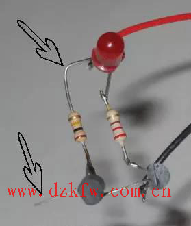 LED、 220歐姆電阻、晶體管的連接如照片中顯示。手指觸摸圖中的兩個點可以點亮LED。由于一只晶體管的放大倍數(shù)有限,想讓LED發(fā)光更明亮,或許你需要用點力兩只手分別捏住兩個點。你的身體相當于一個電阻,電流流過你的身體(手指)給三極管基極提供一個偏置電流。晶體管將流過你手指的電流放大約200倍,這足以點亮LED。
