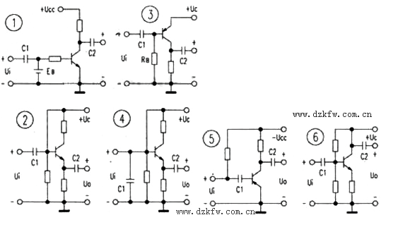由要素之一(三極管具有合適的工作點):圖5為PNP型三極管,應在C極加負電源,但電容C1對直流電源相當于開路,故不能滿足發射結正偏。其他各電路均滿足第一要素,其中圖1為雙電源供電,圖3的三極管也是PNP型,直流電源+Uc從E極加入,通過發射結、RB、地,滿足發射結正偏。集電結反偏。