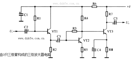 電路中,VT1接成共集電極放大器電路,這是輸入級放大器電路。VT2接成共發射極放大器電路,這是第二級放大器電路,第一級與第二級放大器電路之間采用電容C3耦合。VT3接成共發射極放大器電路,這是第三級放大器電路,它與第二級電路之間采用直接耦合方式。