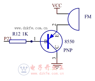 FM是一個蜂鳴器,8550是一個PNP型的三極管,C端接地,B端由單片機控制,E端通過FM接VCC。根據箭頭的方向,E端高電壓的時候,當B端也是高電壓,那么E和C之間是斷開的,當B端是低電壓,那么E和C直接導通,實現開關的作用。簡單的技巧:三極管上箭頭所在方向的二極管,只要二極管正向導通,那么三極管上下就能導通。