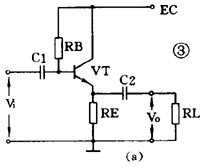 圖 3 ( a )是一個射極輸出器。它的輸出電壓是從射極輸出的。圖 3 ( b )是它的交流通路圖,可以看到它是共集電極放大電路。