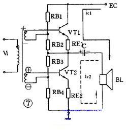 易于說明,先介紹一個有輸入變壓器沒有輸出變壓器的 OTL 電路,如圖 7 。
