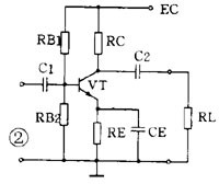 圖 1 ( a )是共發射極放大電路。 C1 是輸入電容, C2 是輸出電容,三極管 VT 就是起放大作用的器件, RB 是基極偏置電阻 ,RC 是集電極負載電阻。 1 、 3 端是輸入, 2 、 3 端是輸出。 3 端是公共點,通常是接地的,也稱“地”端。靜態時的直流通路見圖 1 ( b ),動態時交流通路見圖 1 ( c )。電路的特點是電壓放大倍數從十幾到一百多,輸出電壓的相位和輸入電壓是相反的,性能不夠穩定,可用于一般場合。