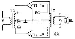 圖 6 是常用的乙類推挽功率放大電路。它由兩個特性相同的晶體管組成對稱電路,在沒有輸入信號時,每個管子都處于截止狀態,靜態電流幾乎是零,只有在有信號輸入時管子才導通,這種狀態稱為乙類工作狀態。當輸入信號是正弦波時,正半周時 VT1 導通 VT2 截止,負半周時 VT2 導通 VT1 截止。兩個管子交替出現的電流在輸出變壓器中合成,使負載上得到純正的正弦波。這種兩管交替工作的形式叫做推挽電路。