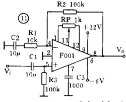 圖 11 是帶調零端的同相輸出運放電路。引腳 1 、 11 、 12 是調零端,調整 RP 可使輸出端( 8 )在靜態時輸出電壓為零。 9 、 6 兩腳分別接正、負電源。輸入信號接到同相輸入端( 5 ),因此輸出信號和輸入信號同相。放大器負反饋經反饋電阻 R2 接到反相輸入端( 4 )。同相輸入接法的電壓放大倍數總是大于 1 的。