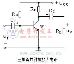 在三極管其射極放大電路中,三極管V的作用是實現電流的放大。集電極直流電源UCC則能夠確保三極管工作在放大狀態。在該電路系統中,集電極負載電阻RC負責將三極管集電極電流變化轉變為電壓變化,以實現電壓放大。基極偏置電阻RB為放大電路提供靜態工作點。耦合電容C1和C2的作用則是隔直流通交流。當這一電路接通后,ui直接加在三極管V的基極和發射極之間,引起基極電流iB作相應的變化,通過V的電流放大作用,V的集電極電流iC也將變化。而iC的變化引起V的集電極和發射極之間的電壓uCE變化。此時,uCE中的交流分量uce經過C2暢通地傳送給負載RL,成為輸出交流電壓uo,由此實現了電壓放大作用。