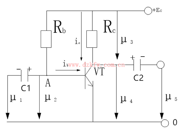 上圖中C1、C2分別是輸入、輸出耦合電容,Rb為基極偏置電阻,Rc為集電極負載電阻,VT為npn三極管,輸入電壓為u1、發射結輸入電壓為u2、集電極負載電阻Rc兩端電壓為u3、集電極發射極之間的電壓為u4、最后的輸出電壓為u5,基極電流為ib,集電極電流為ic,電源為Ec,該電路屬于典型的、基本的共射放大電路,也即輸入和輸出的公共端為發射極。