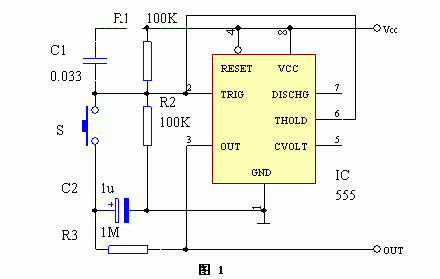 電路見圖1(點(diǎn)擊下載原理圖)。電路剛通電時(shí),C1的存在使IC(555)⑥腳獲得一正脈沖,其③腳輸出低電平,此時(shí)C2上無電壓。按一下輕觸鍵S,C2上“0”電平作用于IC的②腳,③腳翻轉(zhuǎn)為高電平,通過R3對(duì)C2充電。S釋放后,C2充電到Vcc,而IC的②、⑥腳被R1、R2偏置于1/2Vcc,③腳高電平狀態(tài)保持不變。再按一下S,C2上電壓使IC⑥腳電壓大于2/3Vcc,③腳又翻轉(zhuǎn)為低電平。S釋放后,C2上電壓通過R3、IC③腳放電,②、⑥腳的電壓仍為1/2Vcc,③腳低電平的狀態(tài)可維持不變。由此可見,每按S一次,IC③腳高、低電平就變換一次。