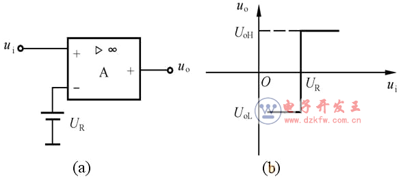 電壓比較器是將一個(gè)模擬輸入信號(hào)ui與一個(gè)固定的參考電壓UR進(jìn)行比較和鑒別的電路。
