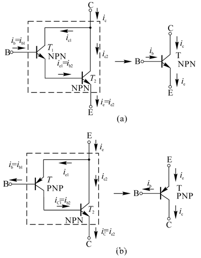 其次,從圖6-34(b)可以看出,復合管的類型與第一個晶體管T1相同,而與后接晶體管T2的類型無關。