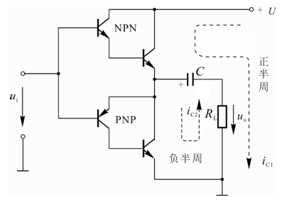 在輸入信號的正半周,T1導通、T2截止、由電源EC提供的集電極電流iC1正向流過負載RL;在輸入信號的負半周,T1截止,T2導通,此時代替電源的電容器C通過導通的T2放電,集電極電流iC2反向流過負載RL。
