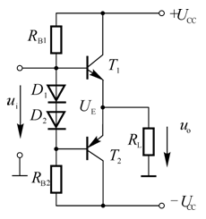 當有輸入信號時,因二極管D1和D2的動態電阻很小,對于交流信號而言,D1和D2相當于短路。在輸入信號的正半周,兩個晶體管的基極電位升高,使得T1由微導通變為導通,T2截止,負載RL上流過 而獲得輸出電壓的正半周;在輸入信號的負半周,兩個晶體管的基極電位降低,使得T1截止而T2由微導通變為導通,負載RL上反向流過 而獲得輸出電壓的負半周。值得注意的是,這種放大電路在設置靜態工作點時,應盡可能接近乙類狀態,否則會影響效率的提高。