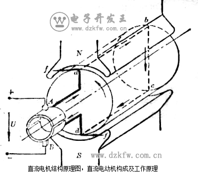 直流電動機(jī)的工作原理如下:如下上圖所示為最簡單的直流電動機(jī)的原理圖。其換向器是由二片互相絕緣的半圓銅環(huán)(換向片)構(gòu)成的,每一換向片都與相應(yīng)的電樞繞組連接,與電樞繞組同軸旋轉(zhuǎn),并與電刷A、B相接觸。若電刷A是正電位,B是負(fù)電位,那么在N極范圍內(nèi)的轉(zhuǎn)子繞組ab中的電流從a流向b,在S極范圍內(nèi)的轉(zhuǎn)子繞組cd中的電流從c流向d。轉(zhuǎn)子載流導(dǎo)體在磁埸中要受到電磁力的作用,根據(jù)磁場方向和導(dǎo)體中的電流方向,利用電動機(jī)左手定則判斷,如圖中ab邊受力方向是向左,而cd則向右。由于磁場是對稱的,導(dǎo)體中流過的又是相同的電流,所以ab邊和cd邊所受的電磁力的大小相等。這樣轉(zhuǎn)子線圈上受到的電磁力 f的作用而按逆時針方向旋轉(zhuǎn)。當(dāng)線圈轉(zhuǎn)到磁極的中性面時,線圈中的電流為零。因此,電磁力也等于零。但由于慣性的作用,線圈繼續(xù)轉(zhuǎn)動。線圈轉(zhuǎn)過半圈之后,雖然ab與cd的位置調(diào)換了,ab轉(zhuǎn)到S極范圍內(nèi),cd轉(zhuǎn)到N極范圍內(nèi),但是由于電刷和換向片的作用,轉(zhuǎn)到N極下的cd邊中的電流方向也變了,是從d流向c,在S極下的ab邊中的電流,則從b流向a。因此,電磁力f的方向仍然不變,轉(zhuǎn)子線圈仍按逆時針方向轉(zhuǎn)動。可見,分別在N,S極范圍內(nèi)的導(dǎo)體中的電流方向總是不變的。因此,線圈二邊受力方向也不變。這樣,線圈就可以按受力方向不停地旋轉(zhuǎn)。這就是直流電動機(jī)的工作原理。