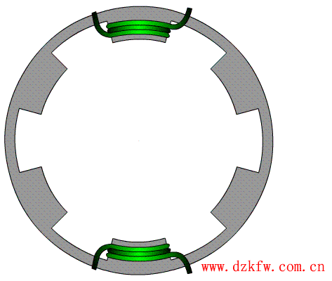 首先我們假設一組線圈(綠色組)通電,那么通電后可以看作是一個豎直的線圈通電,那么它將產生類似條形磁鐵的磁場(當然中間是空的,磁場線是膨脹的而不是像條形磁鐵一樣緊束的)。因此,當線圈通電時候則就相當于定子上放了一根條形磁鐵。
