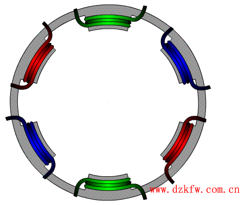 上邊只是一組線圈通電,三組線圈的磁場就相當于三根條形磁鐵成“米”字型放在定子內部。當三組線圈依次通電時候,就會產生不斷旋轉的磁場。
