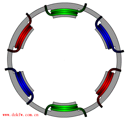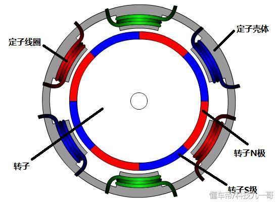 說了這些之后再來看看永磁同步電機的構造,下方是一個三相永磁同步電機示意圖。外圈灰色是固定在車身上的定子殼體,上面間隔繞制著紅、綠、藍三組六匝線圈,對角線為相同組。而中間白色輪轉為轉子,連接著輸出軸到輪胎;其上間隔分布著SN極間隔的磁鐵,實時上你可以理解為四根條形磁鐵首尾相連的粘附在定子上。