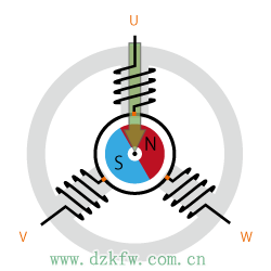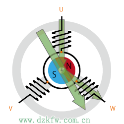 圖2-C:BLDC電機的轉動原理從U相向W相通電,則會產生方向不同的2個磁通量
