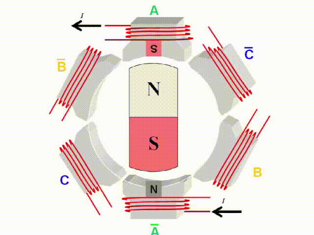 隨著電機轉動,給不同線圈或同一線圈不同兩級通電,使線圈產生磁場兩極與靠近永磁鐵定子的兩極有一個角度,通過同極相斥和異極相吸產生力量,推動電機轉動。