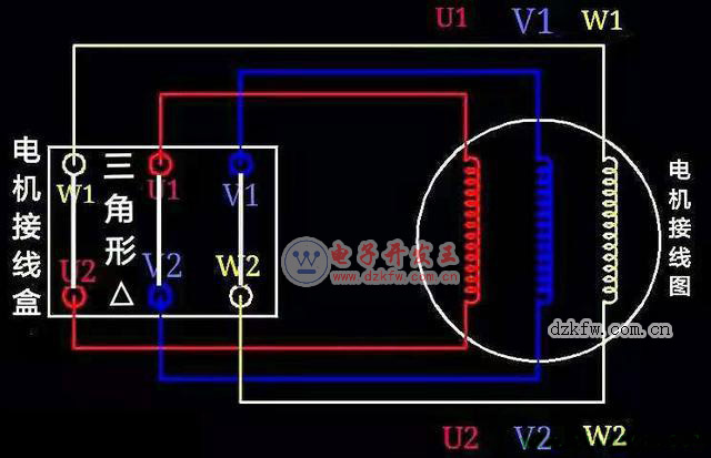 第二相繞組的首端和末端分別用V1、V2表示;第三相繞組的首端和末端分別用W1、W2表示。這6個首末分別引出至電機的外殼的接線盒中,并標注對應的符合用于電工人員的接線。