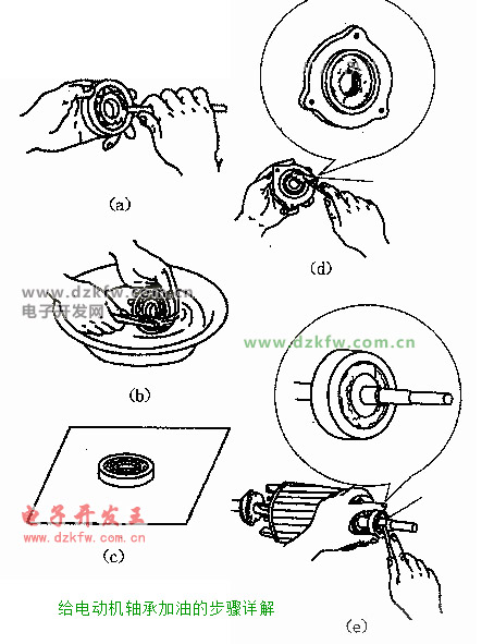 電動機軸承潤滑方法:電動機軸承加油時必須注意:在軸承油蓋上加油時,不能加得太滿,應加到油蓋腔的60%~70%為好,如下圖(d)。在電動機軸承上加油時,把油加到能平平地封住鋼珠即可,如下圖(e)。