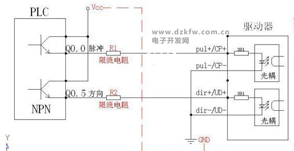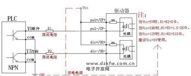 接線一定要以構成回路為準則,如果是共陰極接法,那就反過來把PUL+和DIR+分別接到Y0和Y1了,COM0和VCC并一起接+24V,PUL-,DIR-和GND并一起接0V。接不接電阻同樣要根據上面的原則。