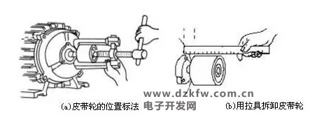 (a)皮帶輪的位置標(biāo)法 (b)用拉具拆卸皮帶輪