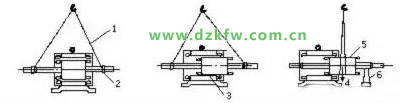 1—鋼絲繩;2—襯墊(紙板或紗頭);3轉(zhuǎn)子鐵心可擱置在定子鐵心上,但切勿碰到繞組;4—重心;5—繩子不要吊在鐵心風(fēng)道里;6—支架;