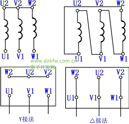 電機內部的繞組中,U1和U2是三相繞組中第一個繞組線圈的2個抽頭;V1和V2是三相繞組中第二個繞組線圈的2個抽頭;W1和W2是三相繞組中第三個繞組線圈的2個抽頭。這樣3個繞組線圈就出來6個抽頭的接線柱。
