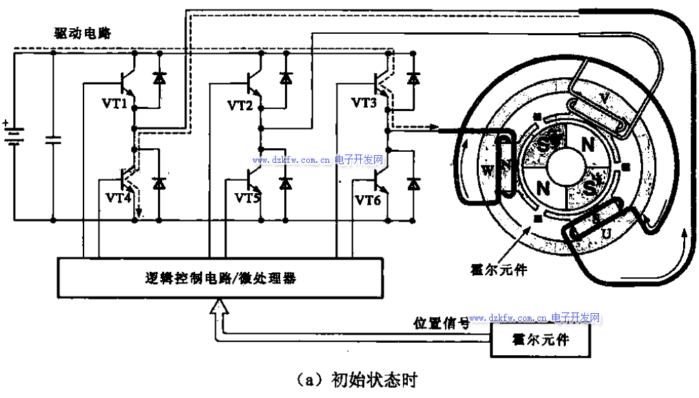 無刷電動機的轉子、定子和驅動電路的關系如圖所示。圖示的初始狀態VT3、VT4導通,電源 的正極經VT3線圈W一線圈U一VT4到負極形成回路,定子磁極W線圈形成N極、U線圈形成S極,V 線圈無電流。由于定子磁場對轉子磁極的作用,轉子反時針轉動。當轉動600后,VT1、VT5由截止變為導通狀態,電流的通路發生變化,即電源正極一VT1·線圈U一線圈V一VT5--電源負極。線圈U處的磁第場變為N極,線圈V處的磁場變為S,這樣使轉子繼續按反時針方向旋轉(600).經過VTl~VT6晶體管有序的切換就可以實現連續的轉動。