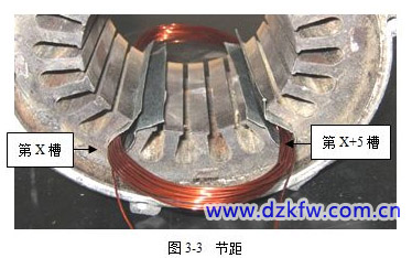 節(jié)距又叫跨距,是指嵌入電動機槽內(nèi)的1 個線把的兩個有效邊之間的槽距(一般用槽數(shù)表示,它接近或等于電動機的極距),如圖3-3所示的最大的線把跨1~6槽,節(jié)距為5。即若設(shè)線把的節(jié)距為x,則該線把跨x槽~x+5槽。