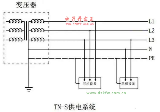 在這種系統中,自電源處將保護線PE和中性線N分開設置,且分開后也不允許再次相接,中性線N僅作為單相用電設備的回路。當電力系統正常工作時,PE線上不出現電流,因此用電設備的外露可導電部分也不出現對地電壓,發生事故時容易切斷電源,比較安全。