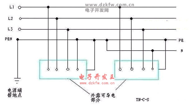 在這種系統中,電氣設備的外露可導電部分在靠近電源側的部分應該至保護中性線PEN上,而在靠近負荷側的部分應接至保護線PE上。