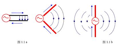 導線上有交變電流流動時,就可以發生電磁波的輻射,輻射的能力與導線的長度和形狀有關。如圖1.1 a 所示,若兩導線的距離很近,電場被束縛在兩導線之間,因而輻射很微弱;將兩導線張開,如圖1.1 b 所示,電場就散播在周圍空間,因而輻射增強。必須指出,當導線的長度L 遠小于波長λ 時,輻射很微弱;導線的長度L 增大到可與波長相比擬時,導線上的電流將大大增加,因而就能形成較強的輻射。