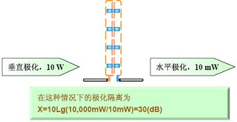 理想的極化完全隔離是沒有的。饋送到一種極化的天線中去的信號多少總會有那么一點點在另外一種極化的天線中出現。例如下圖所示的雙極化天線中,設輸入垂直極化天線的功率為10W,結果在水平極化天線的輸出端測得的輸出功率為10mW。