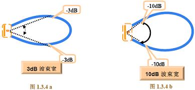 還有一種波瓣寬度,即10dB 波瓣寬度,顧名思義它是方向圖中輻射強度降低10dB (功率密度降至十分之一) 的兩個點間的夾角,見圖1.3.4 b。