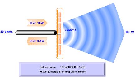 例如,在右圖中,由于天線與饋線的阻抗不同,一個為75 歐姆,一個為50 歐姆,阻抗不匹配,其結果是