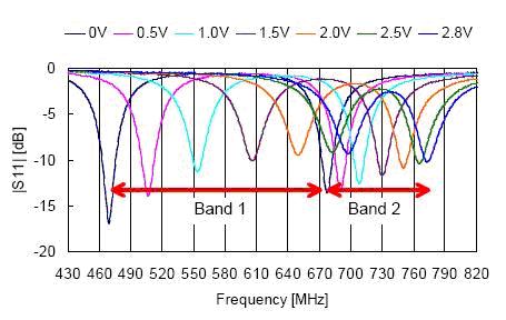 電調(diào)諧天線基本原理與前者相同,不同的是電調(diào)諧天線可以實現(xiàn)讓天線諧振點微調(diào)到所設(shè)計的頻帶內(nèi)每個點,且達(dá)到最好的阻抗匹配、最佳的輻射的性能,如下圖,通過電壓調(diào)整變?nèi)荻䴓O管改變切換點的接入阻抗,以改變天線的等效阻抗,從而達(dá)到實現(xiàn)從470Mhz到800Mhz的CMMB頻段的最佳內(nèi)置天線方案。