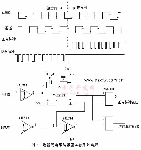 增量編碼器是以脈沖形式輸出的傳感器,其碼盤比絕對編碼器碼盤要簡單得多且分辨率更高。一般只需要三條碼道,這里的碼道實際上已不具有絕對編碼器碼道的意義,而是產生計數脈沖。它的碼盤的外道和中間道有數目相同均勻分布的透光和不透光的扇形區(光柵),但是兩道扇區相互錯開半個區。當碼盤轉動時,它的輸出信號是相位差為90°的A相和B相脈沖信號以及只有一條透光狹縫的第三碼道所產生的脈沖信號(它作為碼盤的基準位置,給計數系統提供一個初始的零位信號)。從A,B兩個輸出信號的相位關系(超前或滯后)可判斷旋轉的方向。由圖3(a)可見,當碼盤正轉時,A道脈沖波形比B道超前π/2,而反轉時,A道脈沖比B道滯后π/2。圖3(b)是一實際電路,用A道整形波的下沿觸發單穩態產生的正脈沖與B道整形波相‘與’,當碼盤正轉時只有正向口脈沖輸出,反之,只有逆向口脈沖輸出。因此,增量編碼器是根據輸出脈沖源和脈沖計數來確定碼盤的轉動方向和相對角位移量。通常,若編碼器有N個(碼道)輸出信號,其相位差為π/ N,可計數脈沖為2N倍光柵數,現在N=2。圖3電路的缺點是有時會產生誤記脈沖造成誤差,這種情況出現在當某一道信號處于‘高’或‘低’電平狀態,而另一道信號正處于‘高’和 ‘低’之間的往返變化狀態,此時碼盤雖然未產生位移,但是會產生單方向的輸出脈沖。例如,碼盤發生抖動或手動對準位置時(下面可以看到,在重力儀測量時就會有這種情況)。