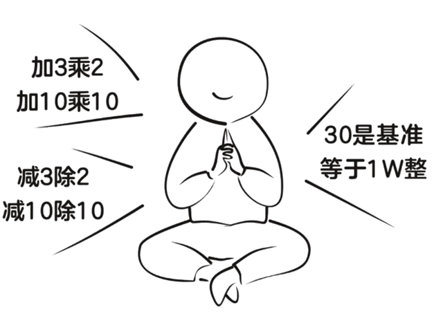 簡(jiǎn)化口訣是“30是基準(zhǔn),等于1 W整”。