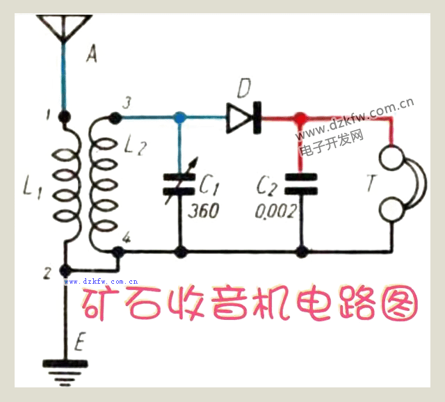 上圖中,A、E分別為天線和地線,可變電容C1與線圈L2組成一個諧振電路,調節C2,即可選擇所要收聽的電臺。D就是檢波用的礦石,C2為高頻濾波電容,用以濾除檢波后殘留的高頻成分。由于這種收音機沒有低頻放大電路,也不需電源,故其需要采用高阻抗耳機來收聽,圖中的T即為高阻抗耳機。