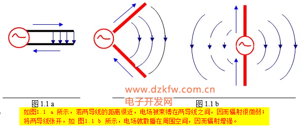 導線載有交變電流時,就可以形成電磁波的輻射,輻射的能力與導線的長短和形狀有關.如 圖1.1 a 所示,如由于兩導線的距離很近,且兩導線所產生的感應電動勢幾乎可以抵消,因而輻射很微弱。如果將兩導線張開,如 圖1.1 b 所示,這時由于兩導線的電流方向相同,由兩導線所產生的感應電動勢方向相同,因而輻射較強。當導線的長度L遠小于波長時,導線的電流很小,輻射很微弱。